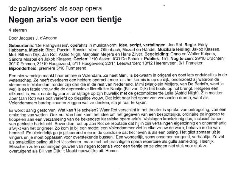 Achteraf hadden we twee try-outs meer moeten hebben. Bij de dubbelpremière in Purmerend viel het kwartje nog niet overal, ook binnen de cast werden nog niet alle mogelijkheden benut. De recensies waren gemengd. Henk van Gelder van het NRC had genoten, maar zijn collega bij de Volkskrant niet. Maar binnen een week waren de vlekken weggepoetst, en Jacques d'Ancona gaf vier sterren. ik vergeet nooit hoe ik tegen het einde van de tour in een bijna uitverkochte Stadsschouwburg in Utrecht in de coulissen stond, wachtend op mijn beurt om op te komen, en ex-Berini Marjolein Meijers de Liebestot van Wagner zag zingen in Volendams kostuum en niemand die het gek vond. En bedacht dat als ik alleen hiervoor al die decennia had gewerkt, mijn leven al zin had gehad.